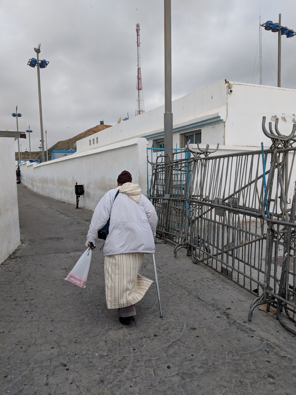 The border was dark and gloomy and smelling of piss. The big beautiful wall features prominently, stretching into the sea. There seems to be no passport control on Spanish side when leaving. The cagey corridors crowned by masses of barbed wire remind me of Polish-Ukrainian border, people dressed as gloomily, crowded in the queue towards the “better” lands.