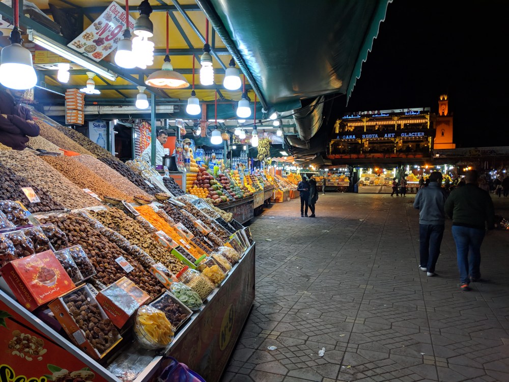 The hotel Zaitoun, the one I booked on booking.com, single room with shared bathroom at €10/110Dh, told me they didn’t have a room or rather “the room has problem with electricity” and they took me to another hotel. Similar arrangement I think, tiny cell-like room around a tiled courtyard, a shower and a toilet per maybe 10 rooms on the same floor, slow WiFi. About 150m from Jemaa el-Fna square.