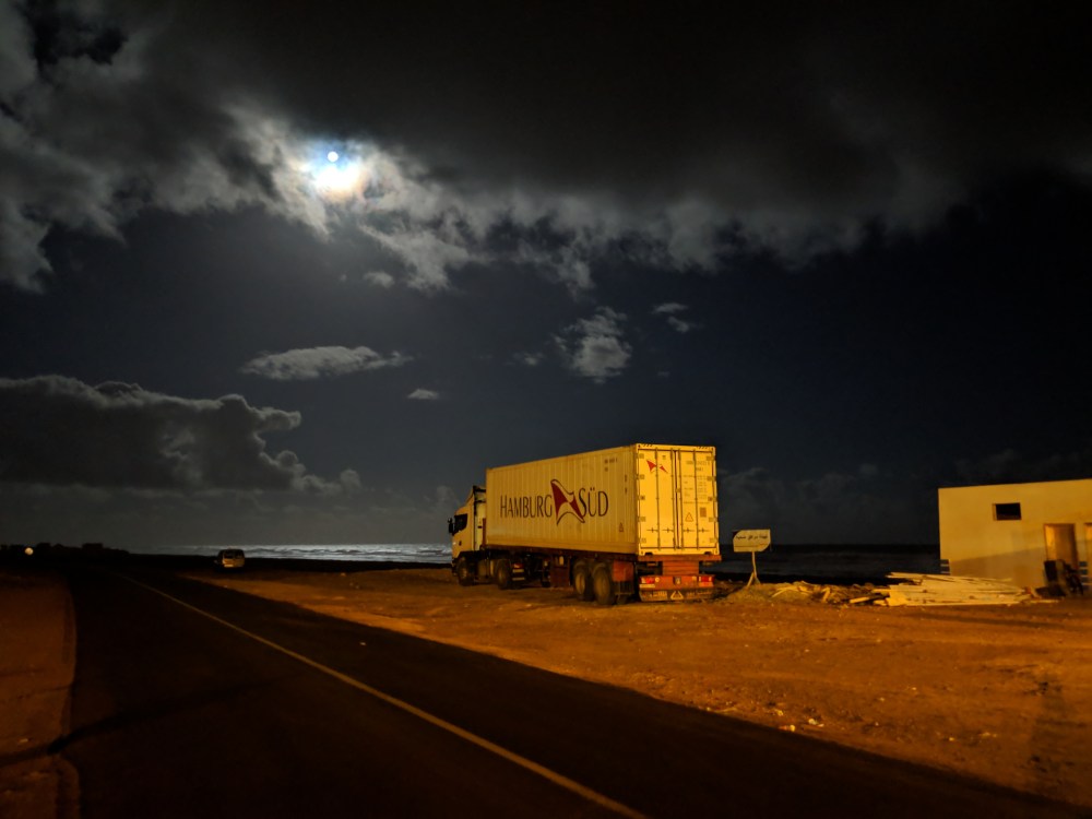 I noticed it around 6am, where we stopped for morning tea. Silver ocean under full moon. Sand. A truck on the side of the road.