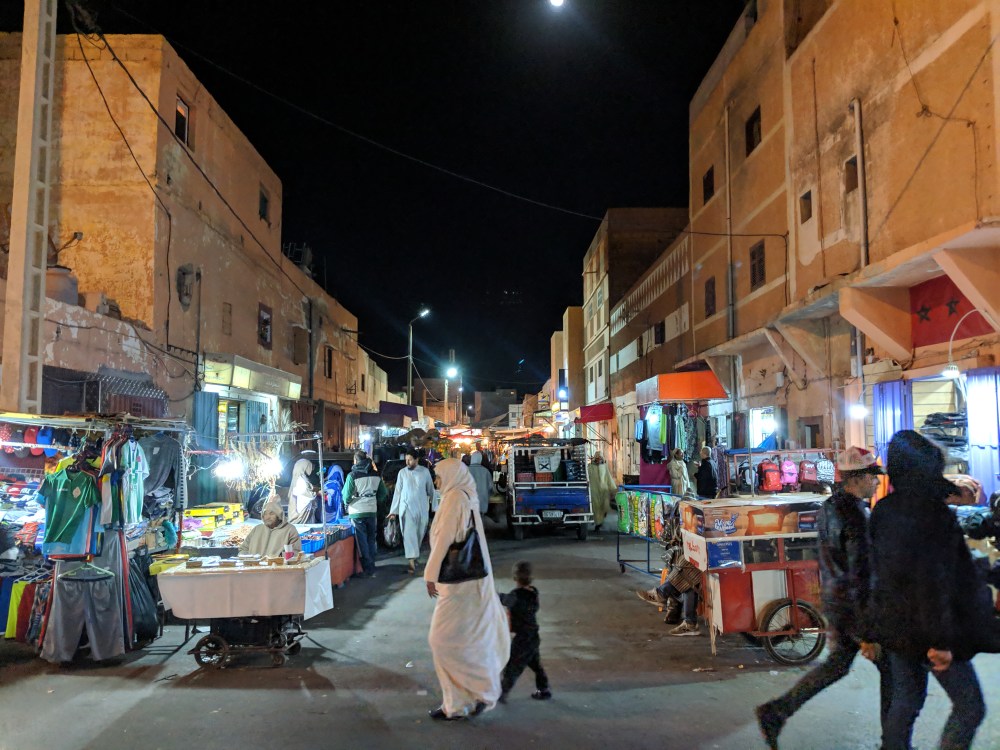 I took coffee, and yet another coffee and went for a walk. Pavements seem to be under construction, of perhaps permanent type. Women cover their faces but some wear fabulous colours. The main square is closed off the public. Around town hall there are streets cordoned off and there is a lot of police. There is a cathedral. I took another coffee. I looked at remote dunes across a seasonal river that looked now a bit like a marshy pond. The wind was strong. I don’t know which language I should use. This used to be Spanish colony but now Morocco sends its settlers to overcome independence tendencies. The taxi driver was speaking Spanish to me when I asked questions in French. The hotel receptionist spoke English to me. Waiters in the bars told me prices in Spanish.
