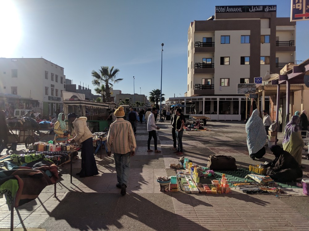 ity itself is washed out cube houses all over but without any obvious atractions. It’s warm around but the wind is strong and chilly. There are more people with turbans, also many more black people. A hotel I stay in, Hotel Sahara, is busy. I had a perfectly grilled octopus for dinner (70Dh) in Restaurant Bahia. I still have a bottle of wine from Ceuta which I probably have to consume before I enter Mauritania.
