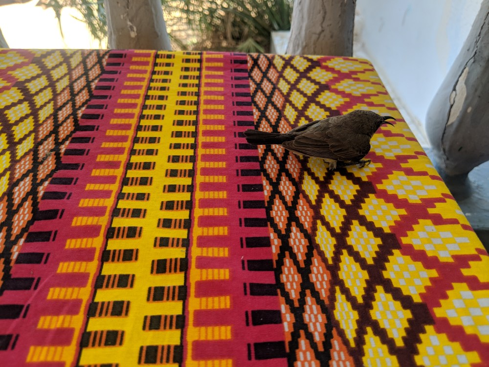 The hotel is by the river and by the time I reached it I forgot about coffee, they had beer! I took a bottle of La Gazelle, I connected to the WiFi and a small bird landed – or rather fell – on my table. First I thought it was dead but it moved but barely. It wouldn’t be able to stand up, it looked like it was on its knees (if birds can even do that). The WiFi was painfully slow, I’d never be able to upload my pics, I switched back on to mobile network and decided to upload them anyway and then just recharge my credit. The bird was slowly coming back to live. It finally got up. It wouldn’t move. I was considering asking the waiter for a bit of water. Several minutes later the bird was gone.