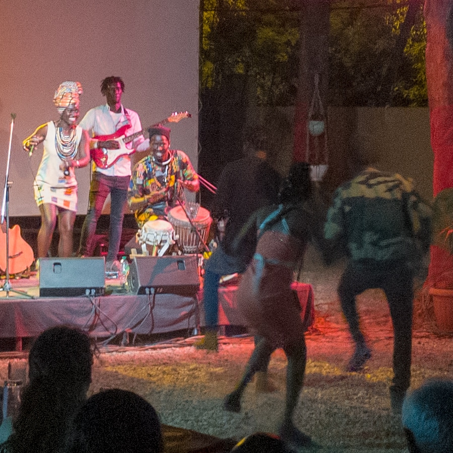 I got dropped by back entrance. I didn’t know it was back entrance but once inside I saw people coming in and paying tickets (2000cfa) through another gate. There were restaurant round tables under a tree and in front of them a small scene.
