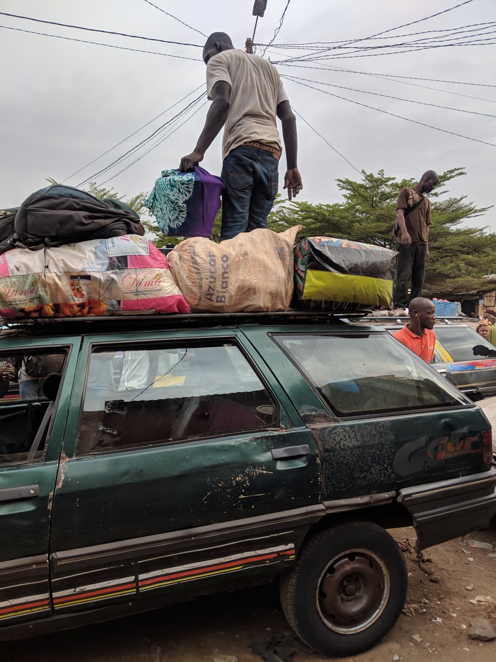 I got my ticket, no. 5 in the car and of course it turned out it’s the car of the full back and middle row. Discussion started but I was being ignored and it was in Fula. Someone at one point rightly said that my ticket has no. 5 so how is it that two rows (of 7 people) were already occupied? It ended quickly, the driver came up to me, asked me for my ticket and handed me the money back. No space for me, unless I buy two seats. Price of a seat: 10,000cfa.
