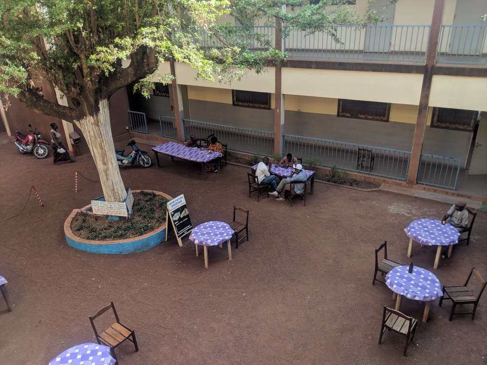 I entered and there was a nice courtyard, tables, chairs, men drinking beer (!), food restaurant. The rooms are 150k or 180k and the difference is whether you have toilet in the room or not, the shower is in each room. There is running water oh what a nice place. I went down, took a bottle of Skol and it’s the cheapest beer in town, 8,000gnf, Guinness for 15,000gnf. And that’s a church hostel. Another great thing about the bar is that it has no music, being Christian they ask for peace and quiet on the premises. I will be able to sleep at night.