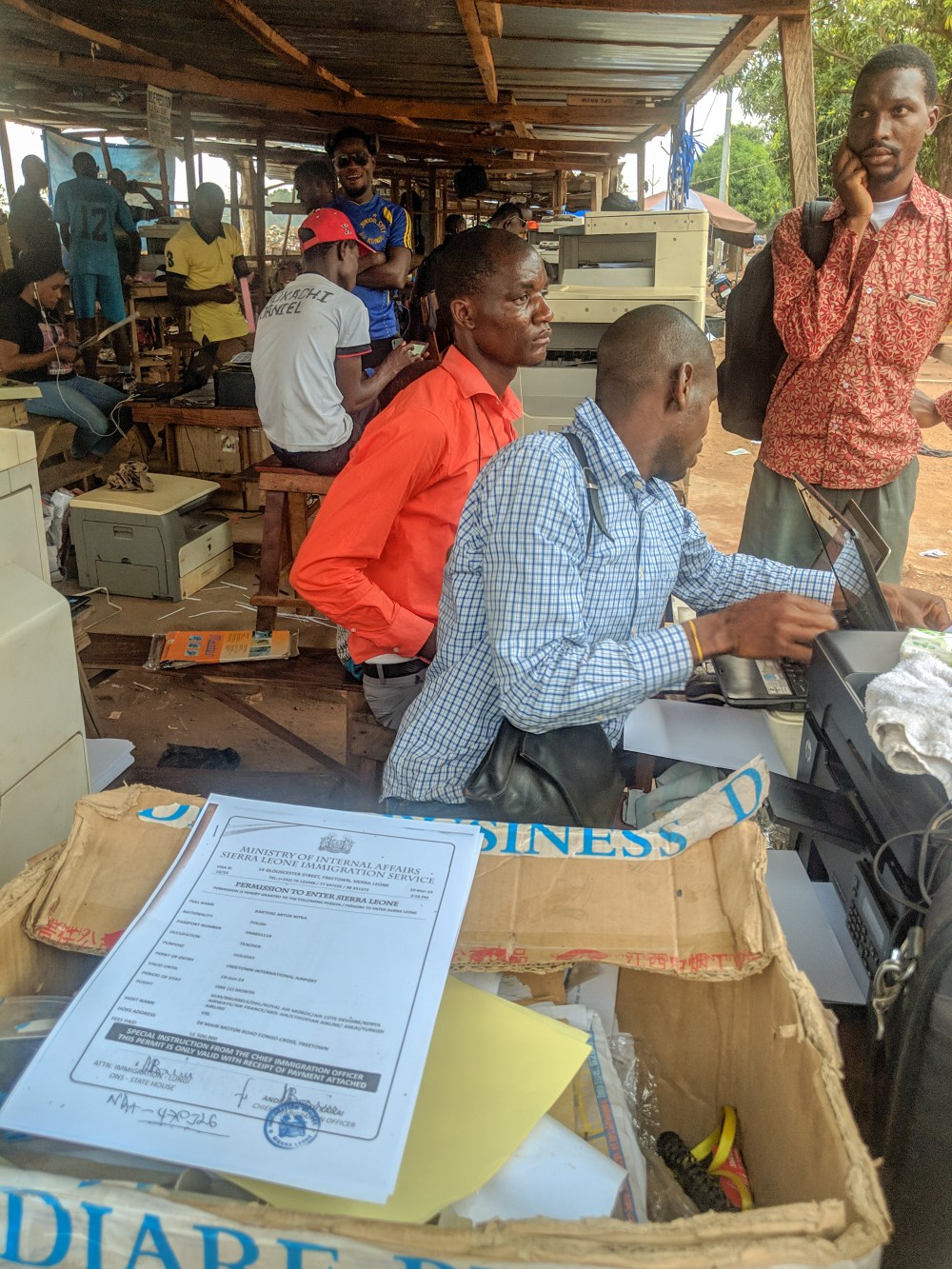 Just before the sunset I went out to look for a printer to print my Sierra Leone visa. The town has a university and I assumed that’s where the printers will be. And I was right. A long row of photocopiers and printers under a tinned roof stands in front of the university. What do they do with them at night? I printed my visa, paid 6,000cfa for the service and then asked the men if I can take a photo of the whole industry here.