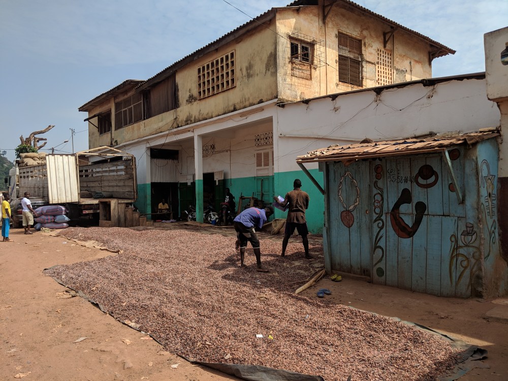 I see men packing cocoa nuts that lie on the ground drying up into bags. It’s another warehouse. I ask for a photo, the man asks me to explain myself and allows for pic and even encourages me. They only sell raw cocoa here, everything else is done already chez vous – in white man’s country. The price of cocoa: 750cfa per 1kg. Coffee – again raw – 700cfa per 1kg.
