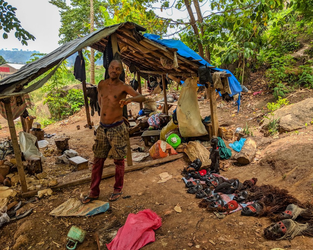 Taxi driver has no idea what I’m looking for so I just get off and keep asking people. It’s there, a simple roof standing on four pieces of wood, so not even a house, with no sign. The man welcomes me, another man comes out from bushes at the rock, third man is asleep. They show me the masks, they are quite nice, I like the one with a tucan-like beak. Some of them have hair attached, made of plant fibre. They are all black, with red stripes over their eyes. I only want to see them, the man doesn’t talk much, so I only manage to get out of him it takes a week to make a mask, the black colour is made by a black paste that’s in a bowl lying on the ground. They only sell these masks in town – who buys them? – and these are masks for tourists. People in villages still use masks but then they make them for special order and differently, gris gris, charms and such.