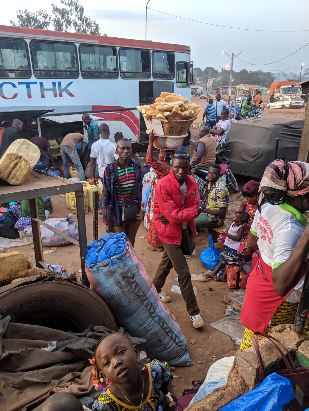 I run down to the other agency. There a woman converses with the ticket window for ever. For ever. Then I crouch in order to talk to the man inside, he tells me to go in through the door. I say I wanna go to Korhogo. He says “but you’ll have to go via Bouaké, is that OK for you?” Yes. The ticket is 10,000cfa, is that the big bus? No, the big bus goes to Abidjan, you go in a small bus. Wtf!I take my seat, 2nd row and not by the window, there are four seats in the row but in the middle there’s a seat that’s folded and if there is no such seat they put a stool in.Somehow the folded seat in the middle next to me is empty.I manage to grab coffee and croissant aux amandes to sweeten the bitterness of my transport situation. The boys loading up bags demand 1000cfa, I pay 500cfa.