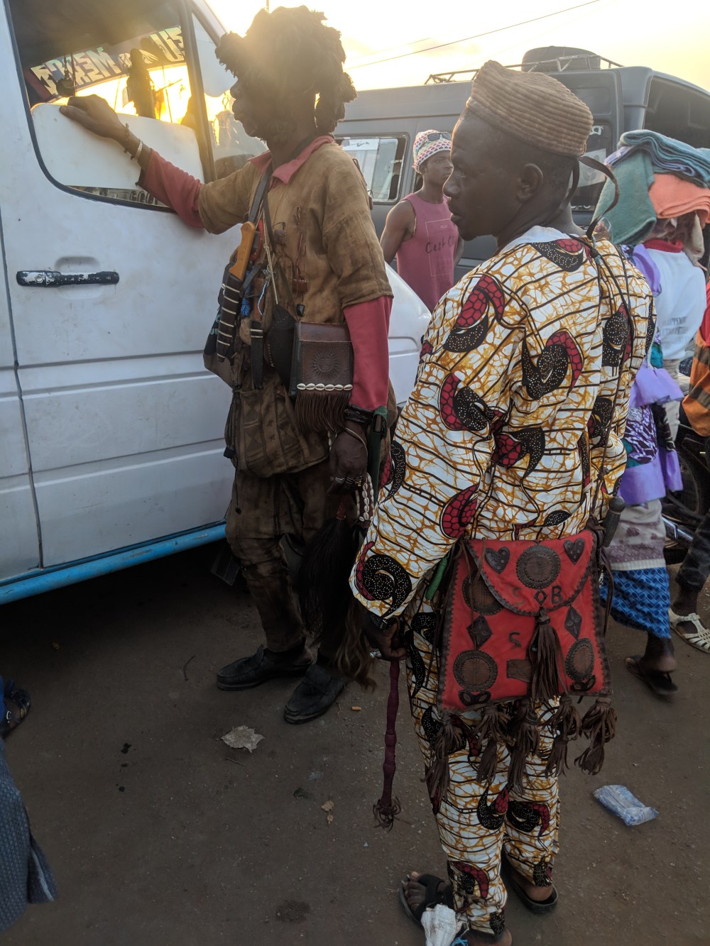 We start about 7:30am. About half an hour later we stop and what seems like a crowd of women, each with a small child in their hands enters, one of them sits next to me.I counted 37 people in the minibus, so indeed with children it was 45 people.The seats are narrow and there is quite enough space for my legs.While I’m looking at the road to Bouaké, I notice that the 6:30hrs alternative has a small ship sign next to it. There is a ferry on the road! But some ferries are nothing else but pirogues which don’t carry anything bigger than maybe a motorbike. The next alternative is 7:40mins/425km, with no ferry. And because the driver’s helper is asking if anyone is going to a town of Daloa, I know which road we are taking, the longer one.The roads so far have been of many kinds, but few were particularly bad. Asphalt is not a common sight but usually if it was there, it was smooth. Forest roads I took on a bike or back of the truck in Bissau. The dirt roads were not really so bad for the dirt roads. A few very bad stretches were in Guinea and these were remains of the asphalt, rough and spiky stones, huge potholes. The stretches of the road like this were not particularly long, 30-50kms.Then there are roads with asphalt cut out as if for preparation to patch it up. Huge rectangles of it missing on either side of the road, the bus violently moving to the other side of the road to pass them if possible. Or stretches of sometimes just few metres of asphalt completely missing. The problem is that those cuts are quite deep and the bus grinds to a halt before or goes down from the asphalt to the dirt in order to save suspension. Then while on the dirt it drives those few meters and grinds to a halt in order to climb back onto the asphalt. And there are simply huge and deep potholes which have to be negotiated. Stop. Climb down. Drive two meters. Stop. Climb up. Front wheels. Back wheels.For 372km we were going like this with maybe one stop for toilet. 372km is where Yamoussoukro is, the newly (1960s) purpose-built capital city, with the largest church in the world.35kms before Yamoussoukro roadworks begin and we drive in white dust fog. Add to it that often traffic is only allowed only one way while the other direction stops.Just after we left Man, we saw a man lying next to his motorcycle on the side of the road, a victim of an accident. We pass many broken busses, big and small being fixed on the roadside.Due to the pothole jumps and pothole skipping maneouvres (left-right-left-right) or maybe because some people were ill, the woman sitting next to me starts vomiting. She seems to be ready for this, she has a plastic bag with a small plastic bucket, complete with a cover. She can barely hold her child on her knees and the boy spends long time standing up. A boy sitting next to the woman throws up at his father. A woman behind them also throws up.It’s of course hot, people behind me keep closing the window because “too much breeze”. The woman on my left sitting by the window wants to open the windon next to us but of course that window is blocked and won’t open.We buy occasional provisions on the road, but that’s mainly water in plastic bags and I manage to snatch up a bottle of bissap juice. A man manages to get a boiled corn knob and I’m jealous, boiled corn I like but most of it here is sold roasted.When we finally stop, my thighs and feet are made from lead but the only good available is 5 boiled eggs that are quickly bought out. There are of course mangoes and avocadoes, and avocadoes are enormous, bigger than the mangoes but these are not foods to eat on the bus. Soon enough, the whole bus eats dry bread. I remember a conversation I had once with OJ, a Cameroonian from the English part of the country, who told me that French maybe have the more sophisticated food but also all they eat is bread. So very true in my bus.From Yamoussoukro – no sight of the enormous cathedral – the road gets slightly better but then it’s the main South-North road so it’s full of heavy trucks.We arrive in Bouaké at 5:30pm. I look for hotels coz I don’t think I will travel to Korhogo the same day. It makes me also wonder how the whole change of busses will work. I found a hotel on African booking.com – Jumia Travel. Later on it turns out the site is worthless.Also, when I get out of the minibus and go to the agency to ask about Korhogo, they look at my ticket, confirm it with my driver, ask me if I bought “direct to Korhogo”. Direct my ass. But there is a minibus going to Korhogo and even further, to Pogo so they tell me to board it.I wanna sit in the back where there are 6 sits on each side of the minibus facing direction of travel sidewards but they tell me to go sit in front but the seats are taken so they give me seat that’s just by the sliding door on the side so I have more legspace. Normally that seat is good but here it’s a nighmare – narrow and five of us don’t fit in the row and of course the bus is so packed with people that the driver’s helper is standing inside, his back right in my face.We have two féticheurs in the bus. Or maybe a féticheur and his helper. I’m quite ashamed that I first thought the féticheur is a beggar, he looks so wretched, his clothes dark and raggedy. But no, he is a passenger, doesn’t answer my bon soir and smokes like a chimney. His clothes are full of gris gris attached to them, he has a long knife and two fly-chasing hair things (I somehow can’t find name for these things). Appropriately for a féticheur, when I try to snap a secret pic, his face doesn’t come out well, the sun sets directly behind him.