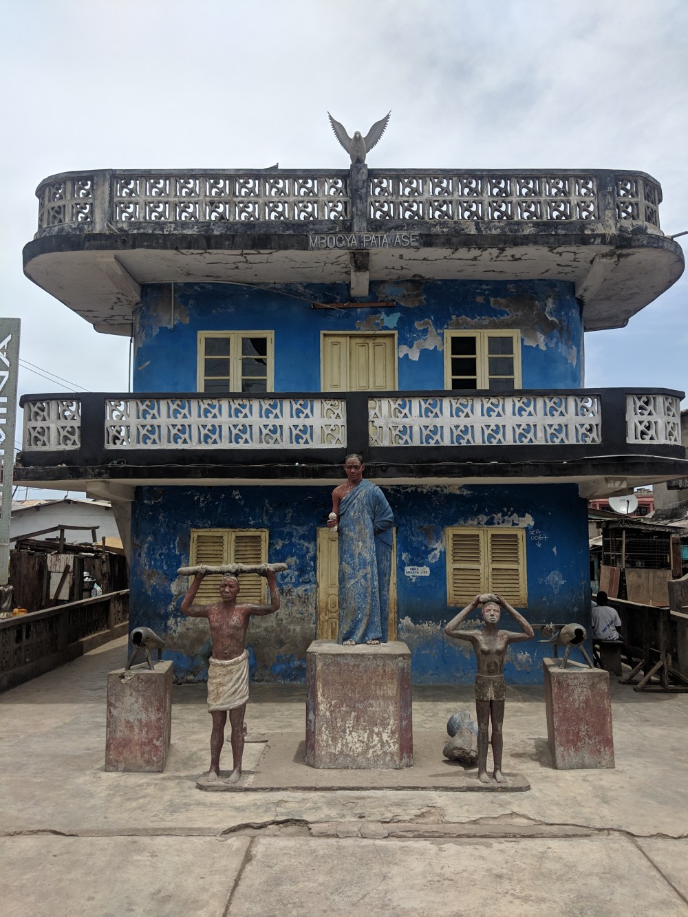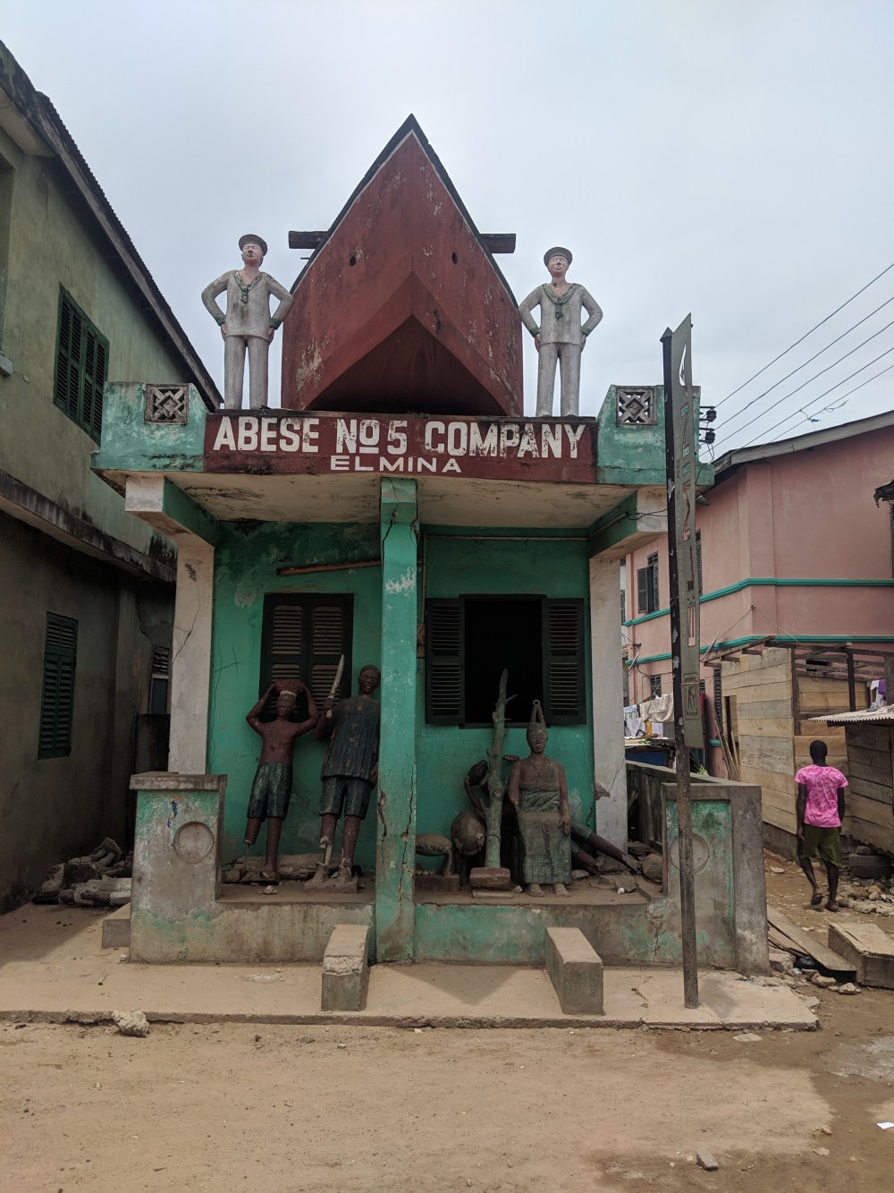The weird shrine houses are weird, with human statues standing in front of them and sometimes an animal among them. Some of them are crumbling, some of them are behind bars so no good for pictures. But the stroll around Elmina is a nice one, the town lively, people friendly and curious. I remember reading “Segu” and there there is a claim that these towns were only built because of slave trade, that they wouldn’t exist or grow otherwise.