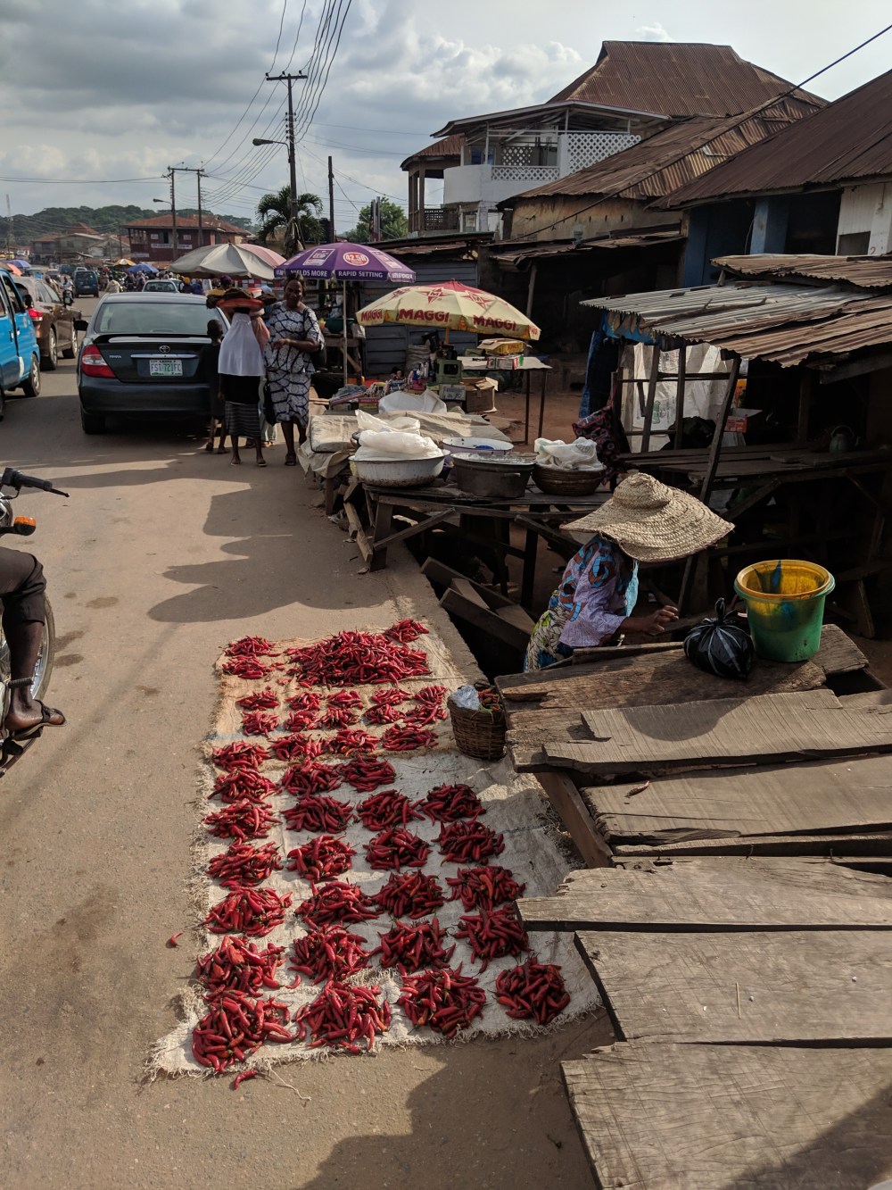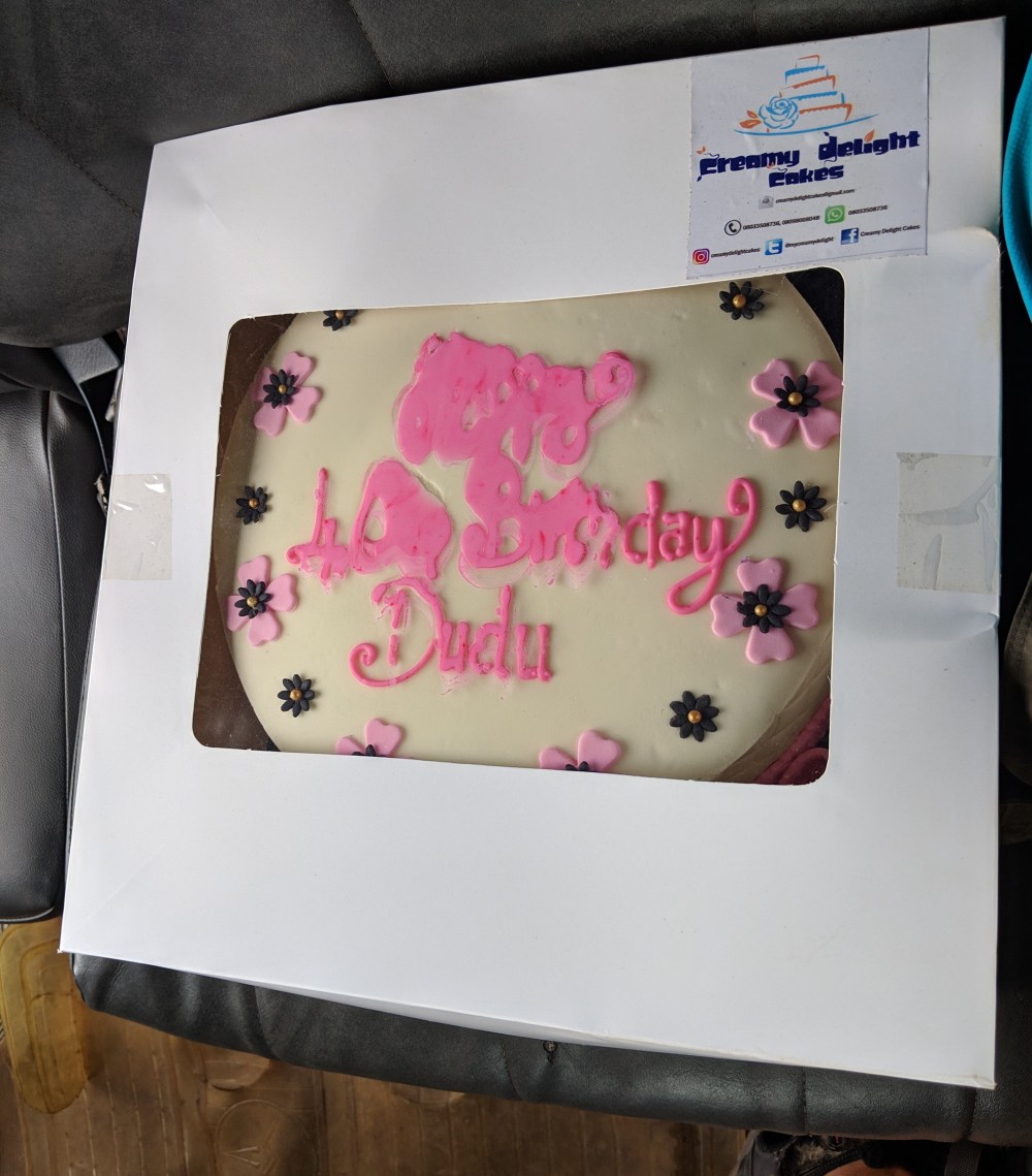 At the motor park we of course were surrounded by men calling us to join their cars, offering a private transport to Oshogbo (“drop”). The minibuses have wooden signs on the roofs pointing out their destinations. Mimy was taking the transport very seriously, she lamented the state of the car, she didn’t like the N2050 price. But the minivan was alright, the price normal. And best of all, it was loaded with stuff so much that it had only 3 passengers, the stuff and the cake. Happy 40th birthday Dudu.