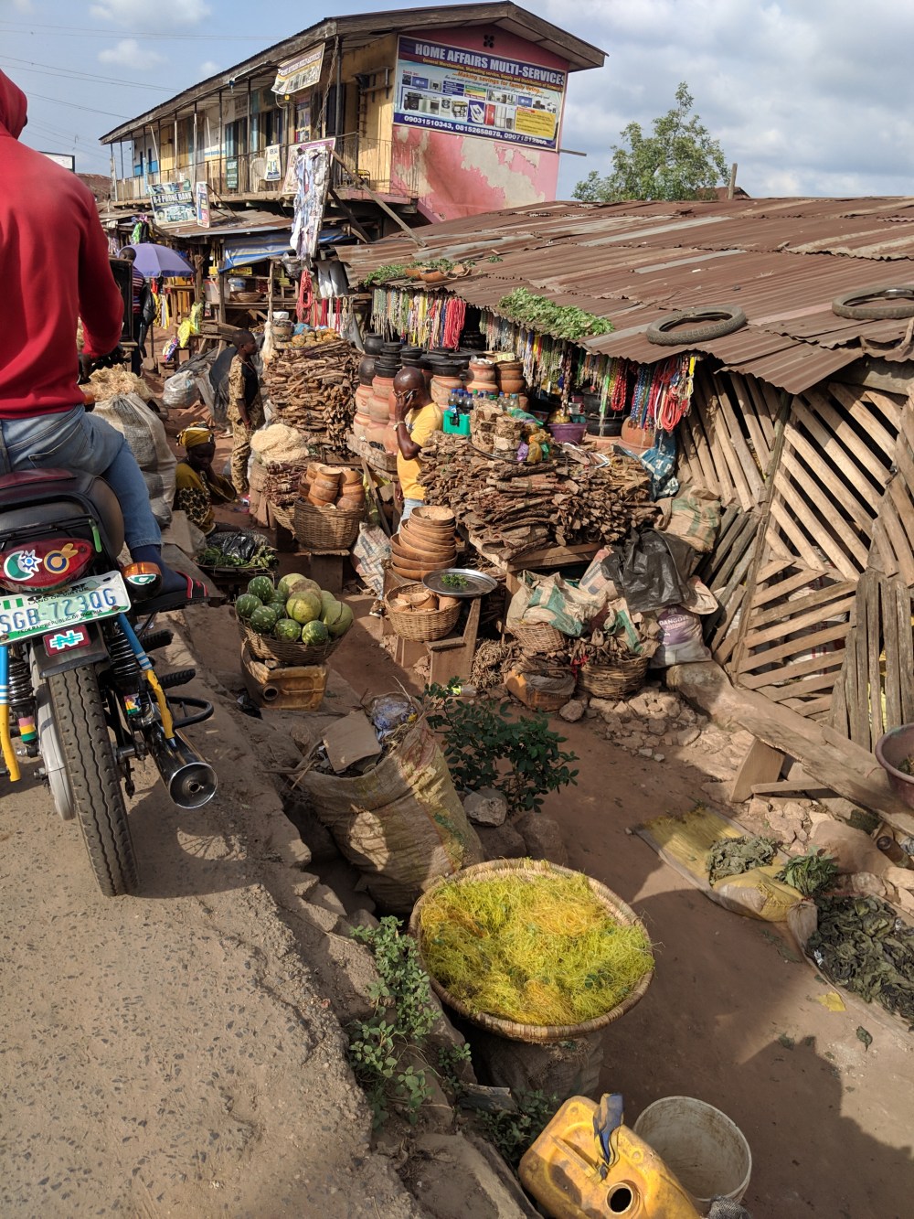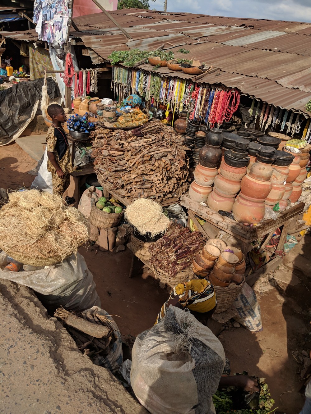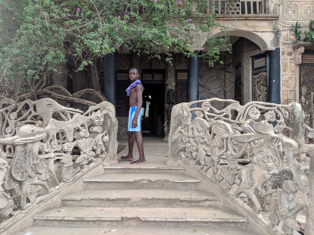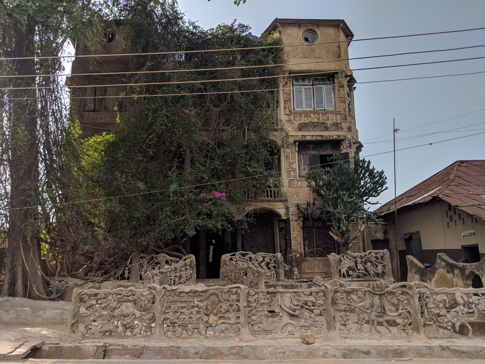 I go on, there is a statue of some monster, by it sits a man, who only speaks Yoruba but the gesture says “give me something”.
