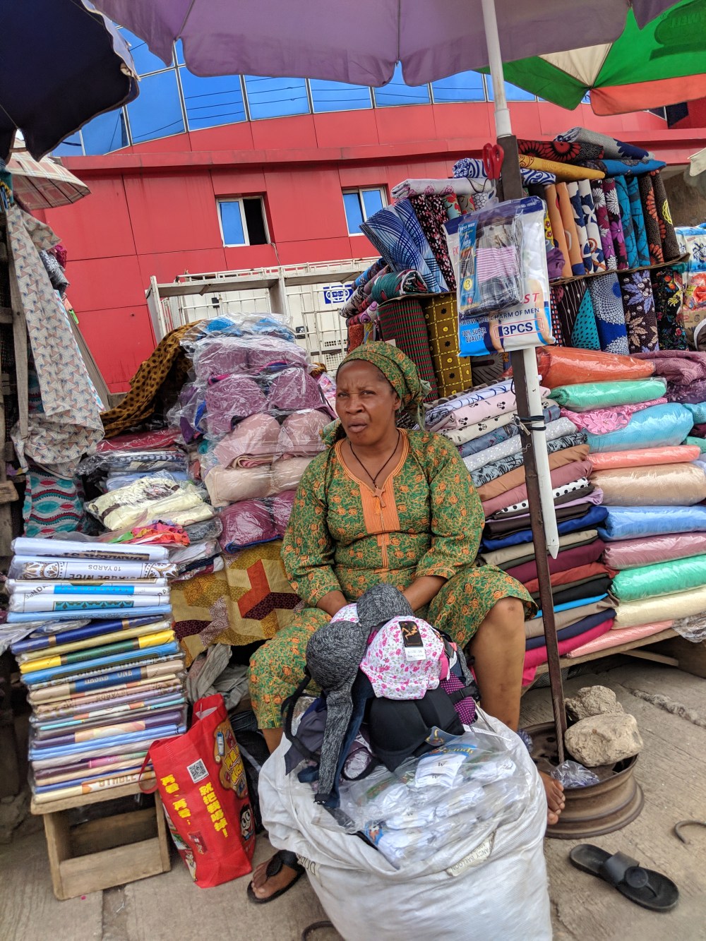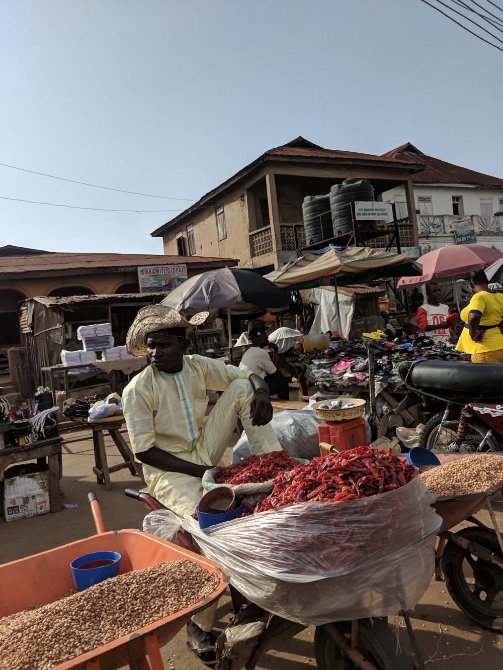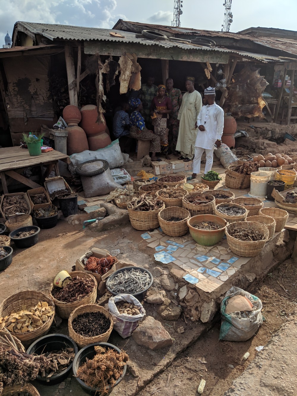 I go on, there is a statue of some monster, by it sits a man, who only speaks Yoruba but the gesture says “give me something”.