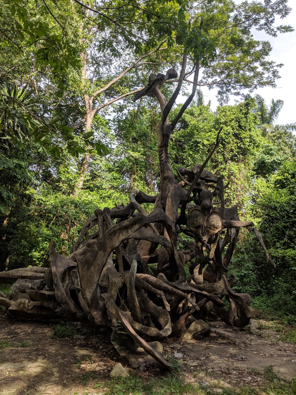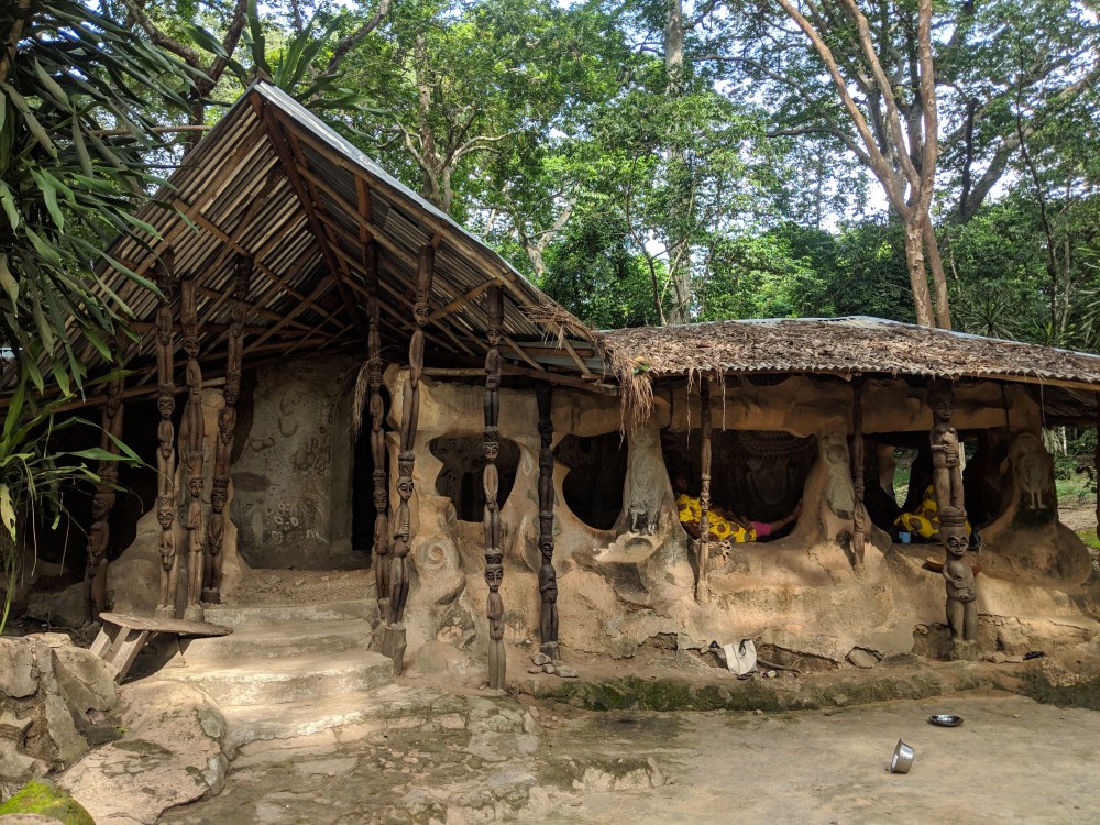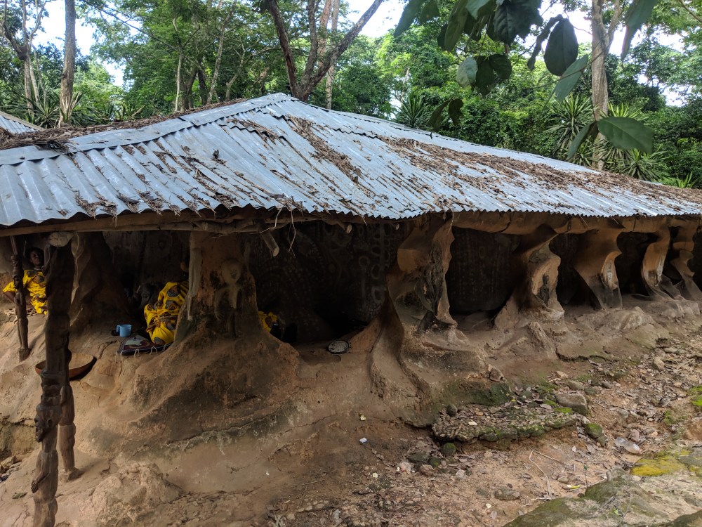 There are very few statues in the forest but the place is quite atmospheric. Those that look like they could be made by Susanna are quite weather-beaten. Of course now without a guide I have no idea what the statues represent. I approach a clearing by the river where what seems like a temple, later I was told it was Osun temple, Osun being the god of water.