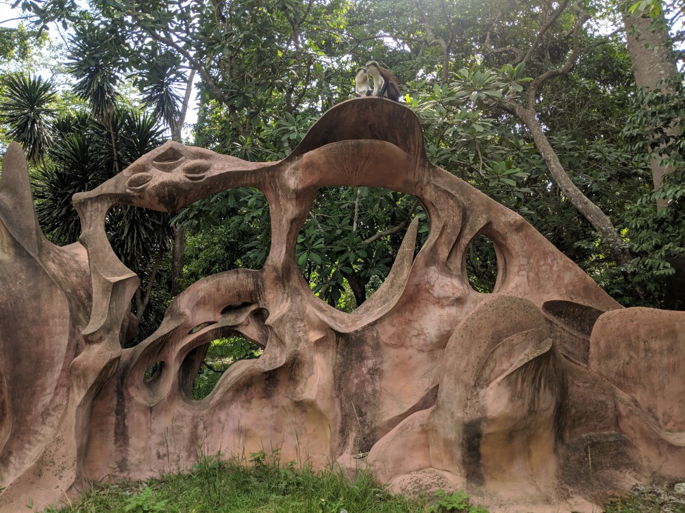 The forest begins, the road becomes quiet, there are many monkeys around and the road is adorned with weird sculptures.