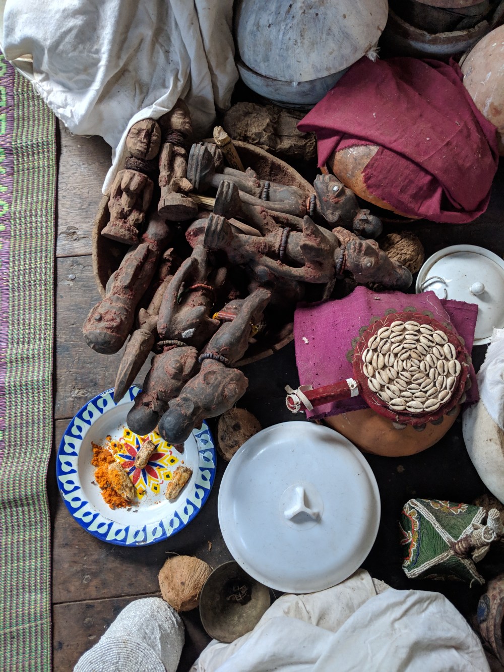 I walked to the sacred forest. The mobile internet was down in town so I couldn’t estimate the distance to the place. The Bradt Guide map of town was very vague, marking only major streets and no scale. To add to my phone issues, since Cotonou charging of my phone takes forever – last night it only reached 67% of charge by the morning – and I am now on 37%, of my two cables, one is partially broken, the other – bought in Cotonou, in beautiful blue – charges extremely slowly. I take powerbank and the blue cable and I walk out. It quickly turns out the blue cable is also broken and doesn’t connect, the powerbank has barely any energy left. I put the phone onto the airplane mode and keep walking.