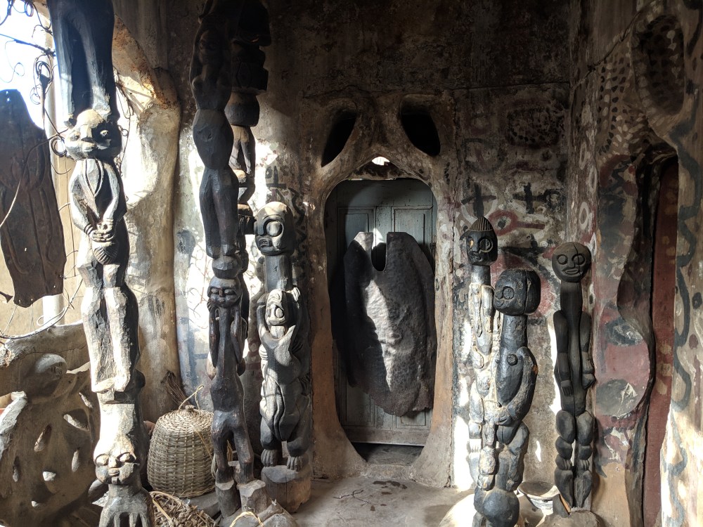 I enter, the doors are open, inside is full of sculptures. I hear voices upstairs I walk up, a woman asks me to wait, calls a mama. After a while the mama comes out, apologizes for waiting – it’s hot so she said she was sitting naked – and lets me into a room also full of sculptures. She says she is preparing for water rituals and she is quite talkative and wants to talk about Susanna and her life, she knew her and do I have any questions? I feel stupid because I don’t even know what to ask. I give her N500, she asks me to sign a guestbook, then disappears in another room then comes back with a writing pad and I see it’s no guestbook but some sort of diary, written in Yoruba. I sign it.