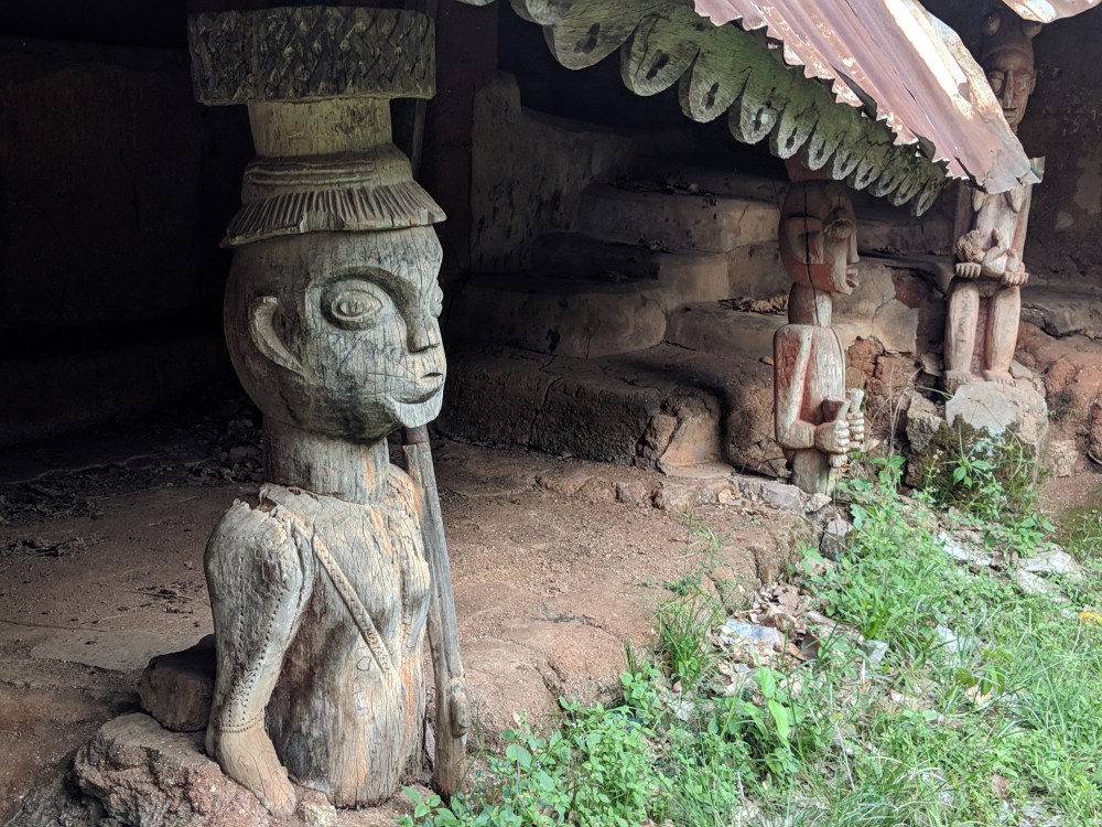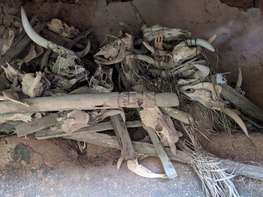 We went on to the ancient palace. Inside there were some sculpted columns representing warriors and farmers and plenty of cow skulls. Traditionally every year a cow skull was placed in a corner of the palace to count the number of years a current king is ruling. Now, as Paul said, “we have computers” so we no longer count the skulls but they still place them in that place.