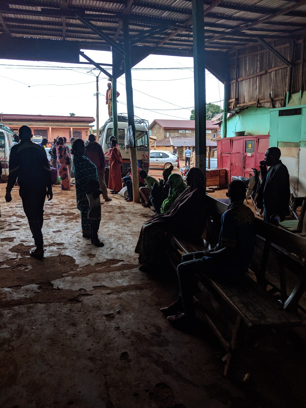 By the time I reached the bus terminal it was properly raining. The bus doors were closed, people sat around on benches, some were still waking up from the night, lying on mats. The load was being loaded on top of the vehicle.