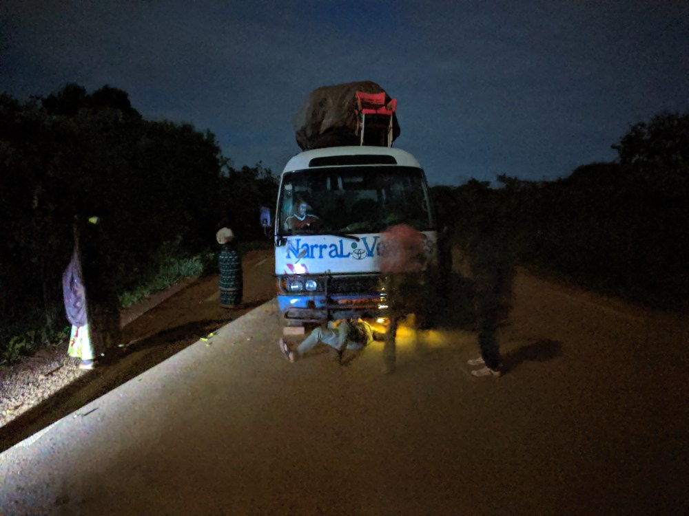The bus started making noise again. We stopped on one of those mysterious asphalt stretches and waited for the driver and his helper to fix it. The moon was bright, the insects noisy, a magical African night, if only the bus worked.