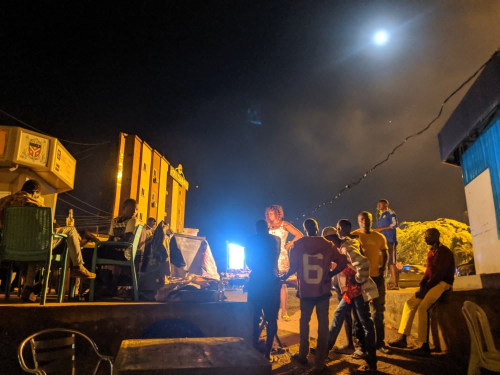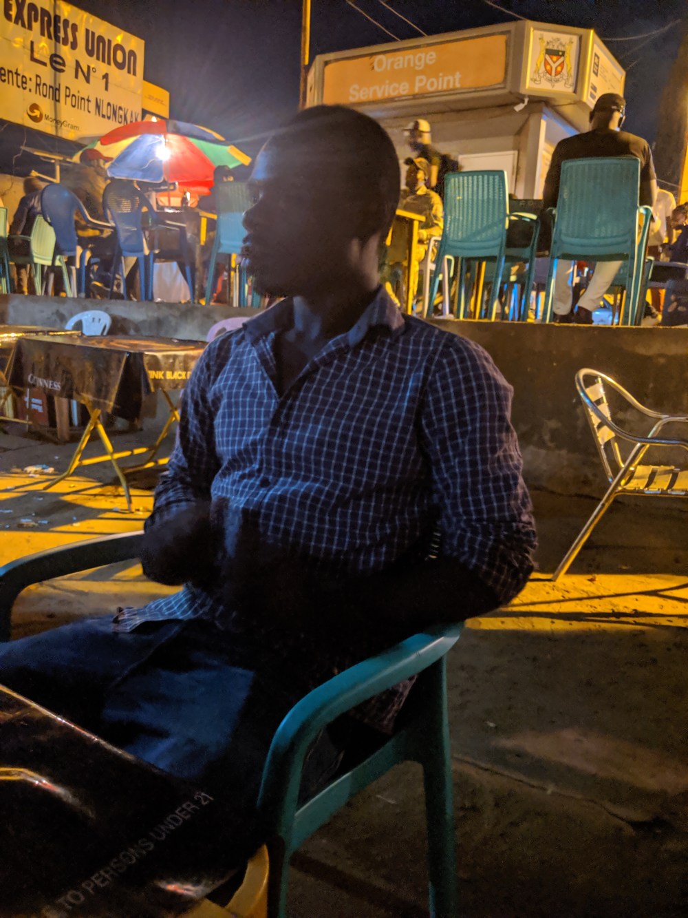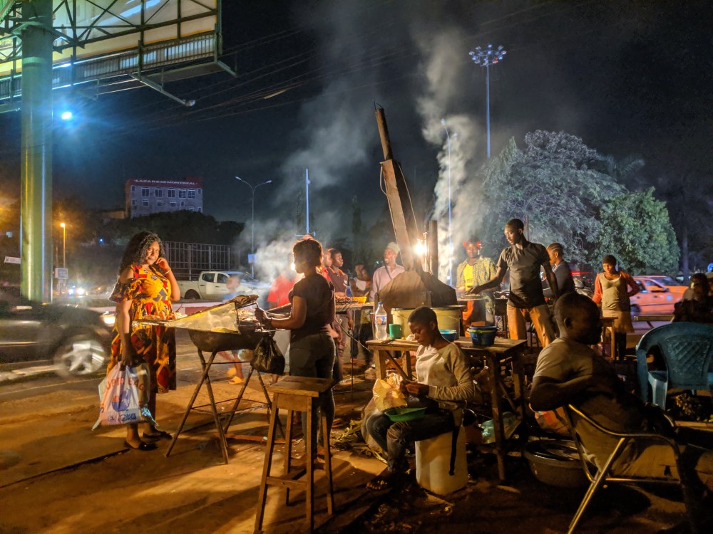 It was already getting dark, I went out. There are plenty of fish barbeque stands around, I sat down at one, chairs and tables outside, mackerel with baton de manioc for 1000cfa. Beer was 750cfa for big lager but then I started hearing the familiar pas de monnaie. The waitresses were as indifferent to customers as they could possibly be without being unfriendly. They handed over small pieces of paper stating the amount they owed and demanded people came the next day to collect due change. It’s good I had some coins on me but they soon ran out.