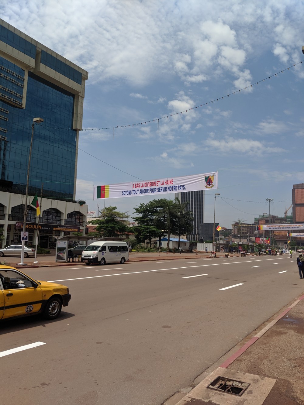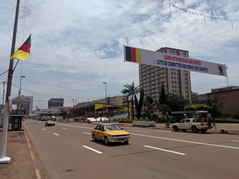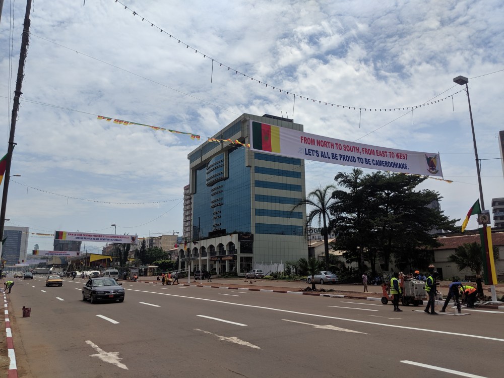 I took shared taxi, 250cfa to the city centre, where the parade would take place the next day. The place was being set up, full of country flags and propaganda slogans, many praising the current president, who’s been in power since 1982.