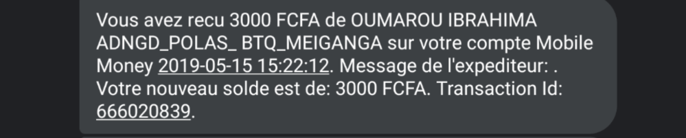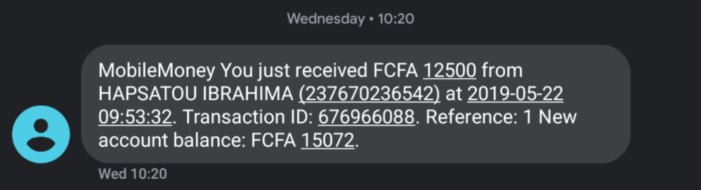 But I didn’t have time to think about it because immediately the person who sent the money was calling. A guy telling me it was sent by mistake. I barely heard him, I was in the bus, he switched to English and he told me how to send the money back. He even said I’d be charged 200cfa for it so I can only send him back 12300cfa. And I did but the message I got was that I didn’t have enough money on my account. I checked my account and it still showed the 200+ CFA. I checked the operator’s app and it also showed 200+ CFA. Then I looked at the message I got – it came from the phone number that allegedly sent me the money (237670236542). When I buy internet, I first get the credit on my phone from someone on the street and then buy a data bundle. And when I buy the credit the message always arrives.
