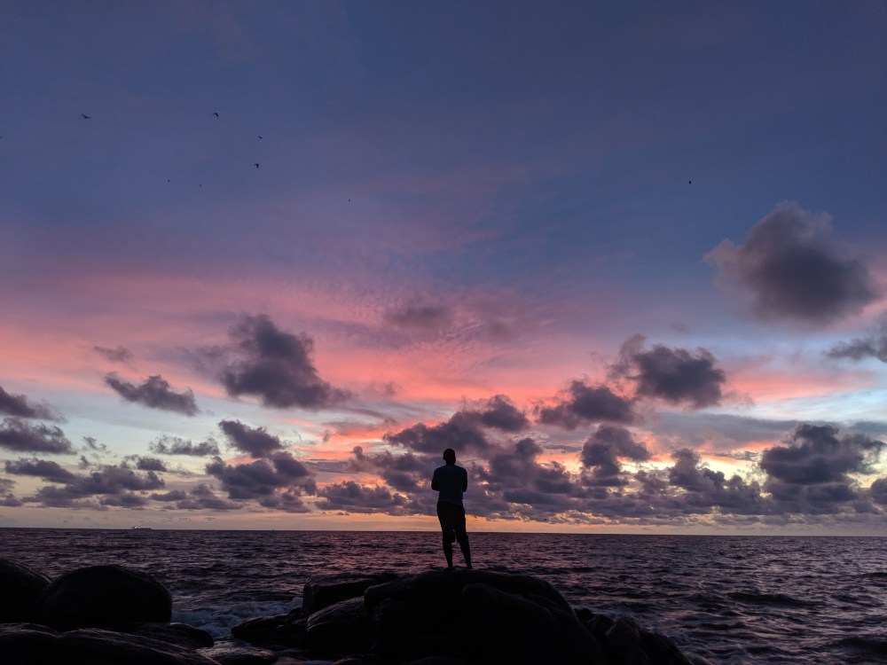 It was getting towards sunset, I walked towards what seemed would be direction beach. Some boys asked me to buy them a football, theirs was getting flat. When I realised I was going actually away from the beach, it was already getting towards the sunset, I took moto to the town beach. The beach was very small and there were rocks in the water. People came out to see the sunset, which was beautiful, blue and pink.