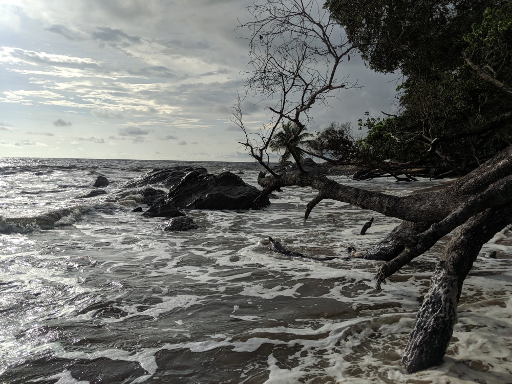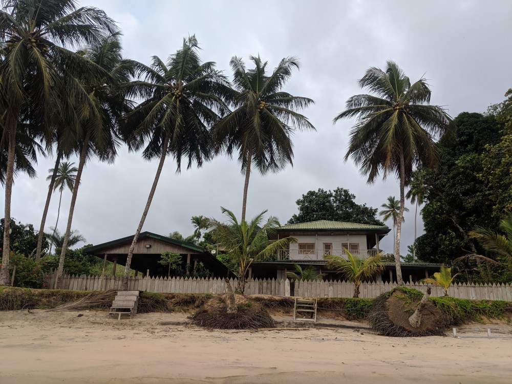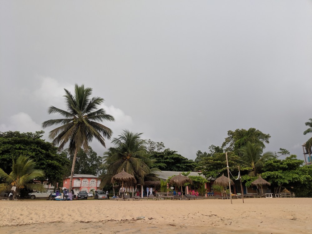 I wanted to repeat the afternoon walk, hoping perhaps for a lower tide. But the tide was high and it started raining much earlier than the previous day so I ended up at Beau Séjour halfway to the falls. The cheapest room there goes for 35,000cfa. It has a very nice location but there is no beach to speak of, just the fallen trees.