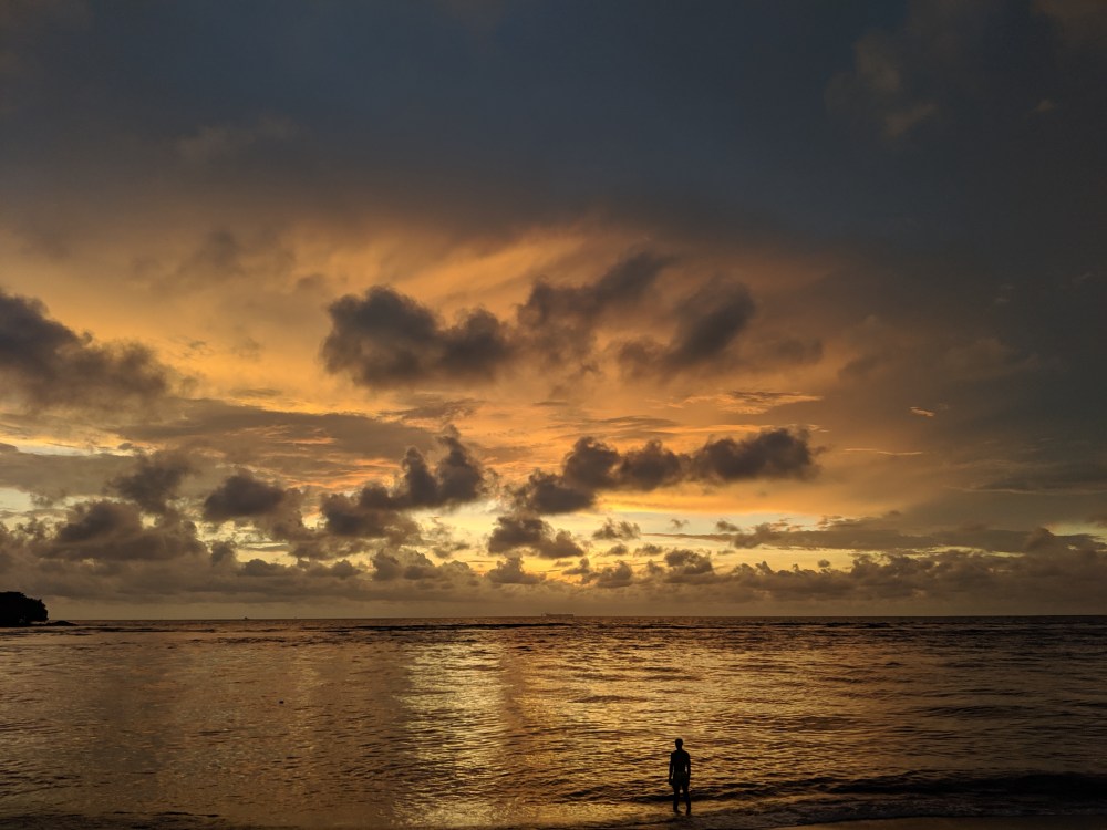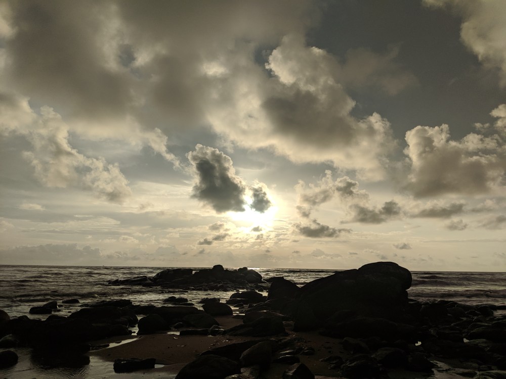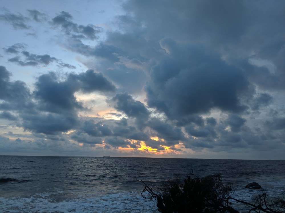 I walked on, the tide was high and the sea not that calm, possibly due to the rainy season. There were a few people already swimming. Some remote couples on the rocks.