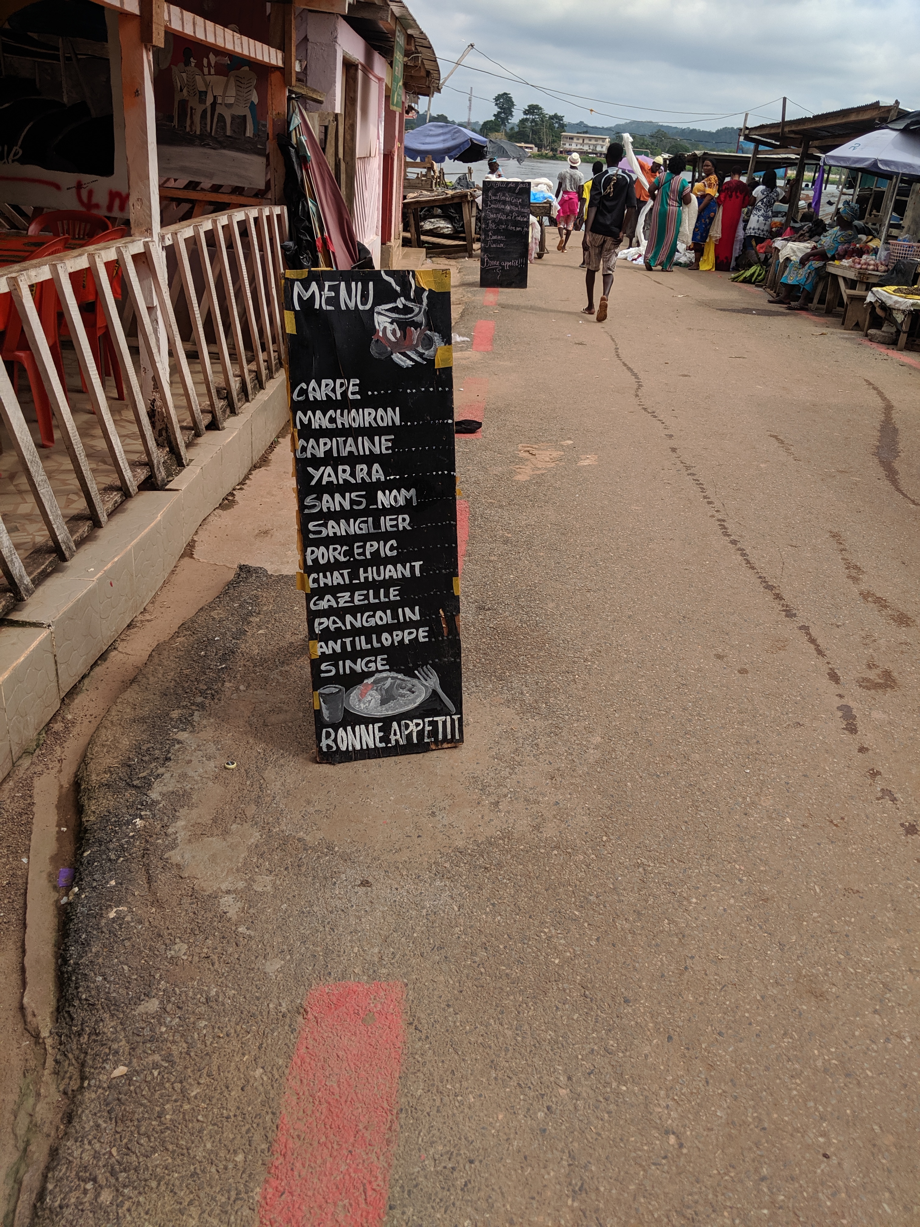 Resigned I walked to the market to see if the bushmeat restaurants were already open, I wanted to snap a photo of their exotic menu. The menus were already out. Note the pangolin. Bonne appétit!