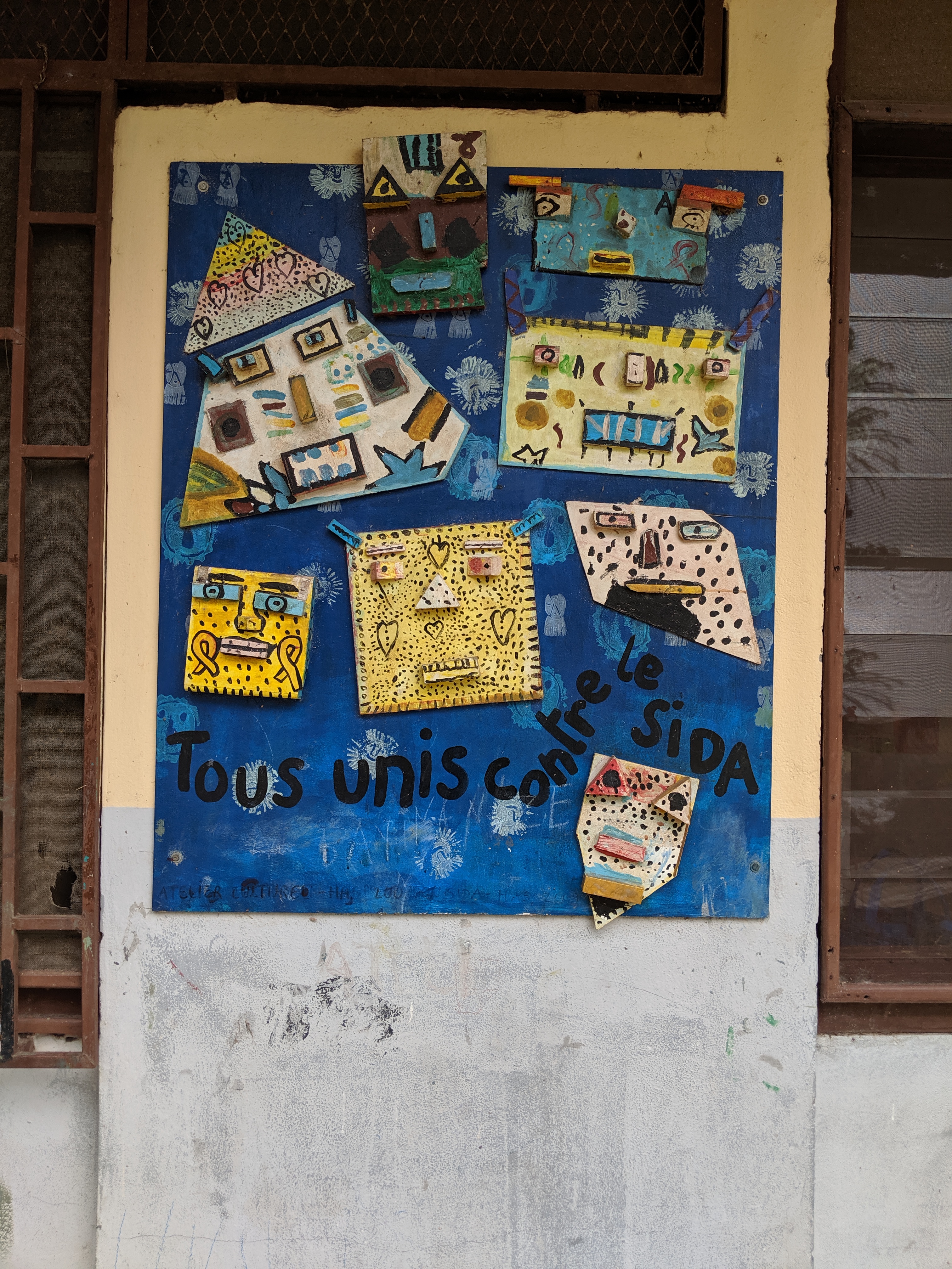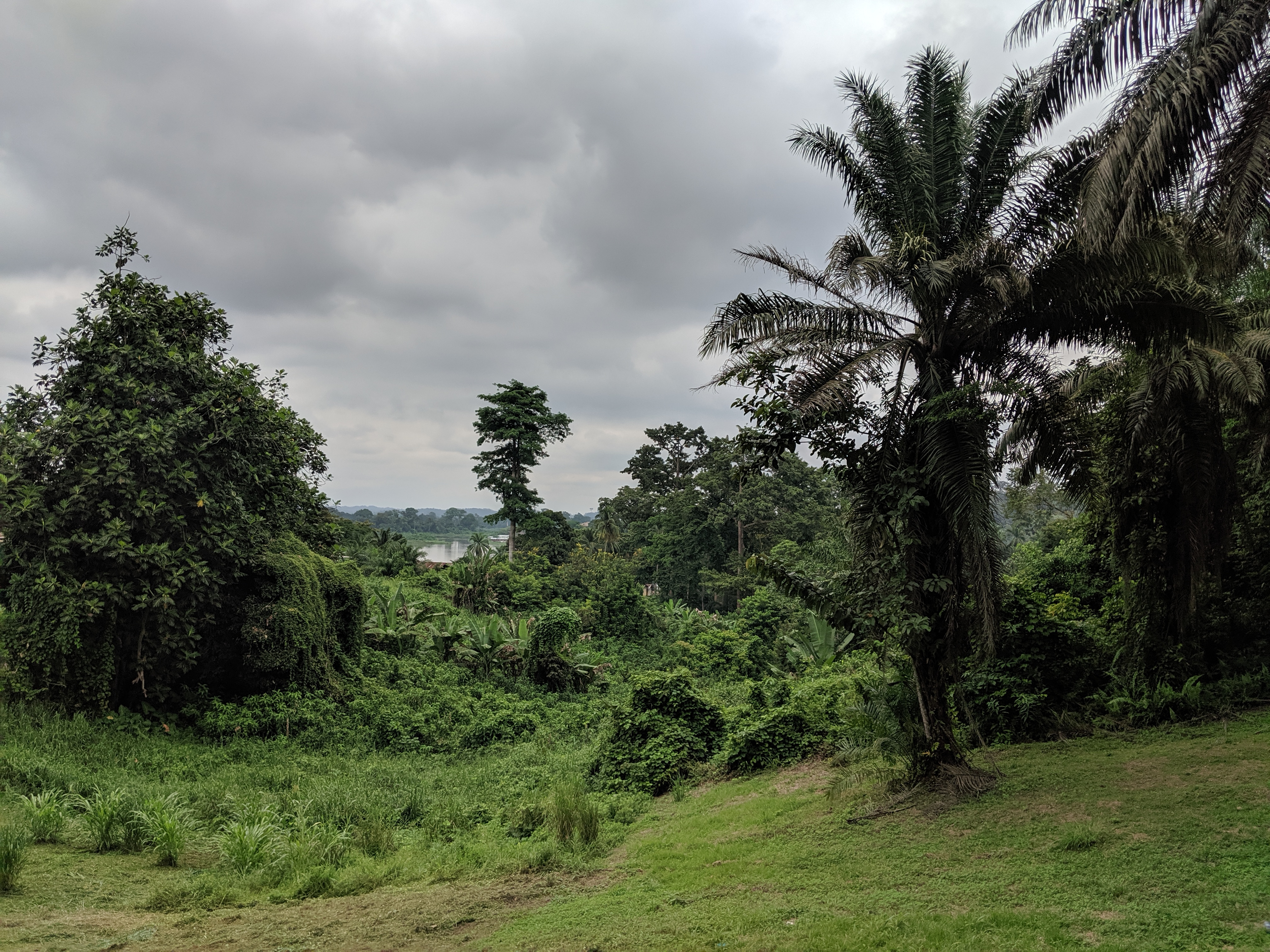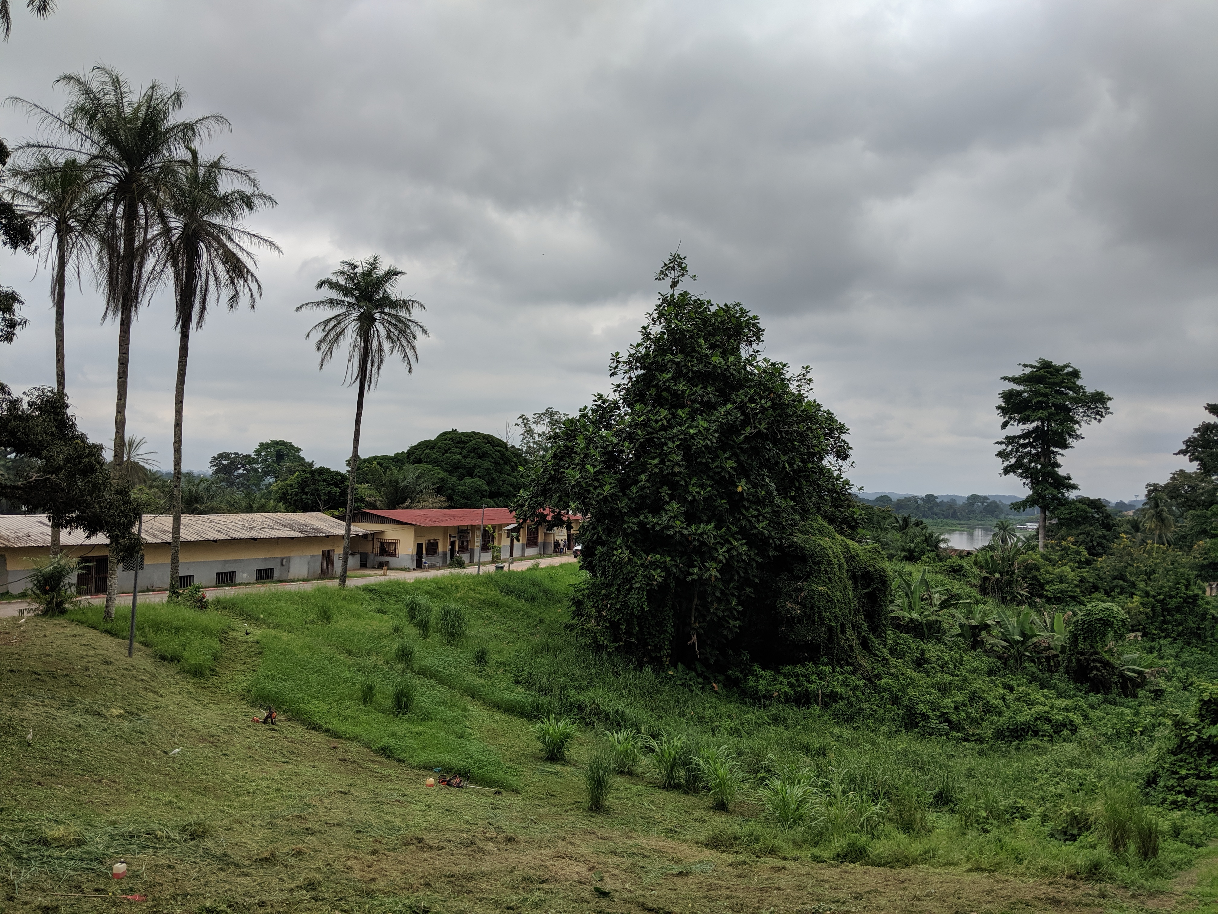 The trip was short, a bit over an hour. At one point the forests stopped and we drove through what looked a bit like savannah. Savannah on the equator? We passed equator coming from Libreville to Lambaréné but the bus didn’t stop for celebration. So we drove through high grasslands, there were even gentle hills around.The driver dropped me in front of Motel de Bonheur, a poorly-looking compound. Dark rooms windows replaced with wooden boards and AC machines (not working) with toilet and shower, 6000cfa.
